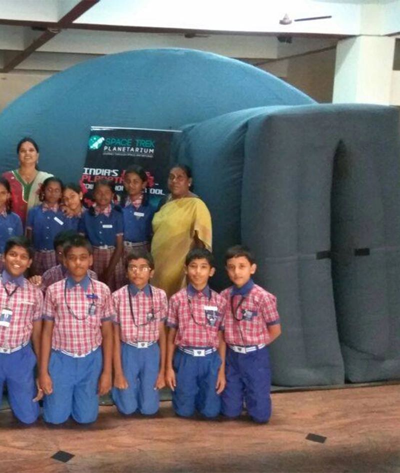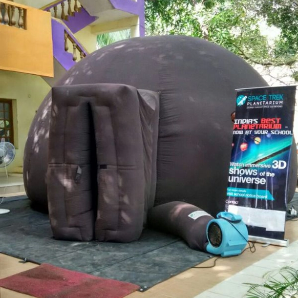 Absolutely. The dome planetarium and all supporting modules adhere to strict safety standards. The inflatable dome is made from fire-retardant materials, features proper ventilation, and is continuously monitored during sessions. All electrical and projection systems are safely enclosed, and staff remain present throughout the program. Since it’s conducted indoors, weather conditions do not affect the event. The mobile planetarium setup ensures comfort, safety, and accessibility for students, teachers, and even young children attending the sessions.